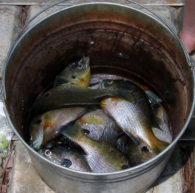 There are several choices for live bait; red wigglers, crickets, meal worms, and I have found Shell Crackers / Red Ears like pink worms! There are also pre-made baits such as flavored nuggets and bait imitations that work well.